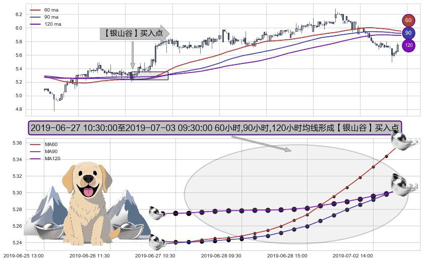 形态多维评估: ⚀ 2019-06-27 11:30:00-小时至2019-07-03 09:30:00-小时显现 60小时-90小时-120小时均线 【银山谷】买入点 看多信号,后市看涨,买入
