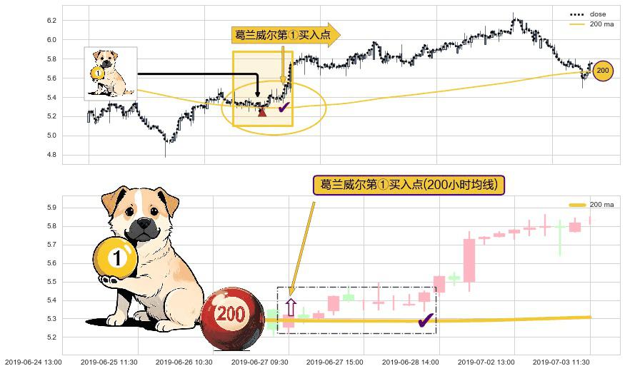 形态多维评估: ⚀ 2019-06-27 09:30:00-小时显现 葛兰威尔均线 200小时均线 第买①入点 走势反转见底信号,后市看涨,买进信号
