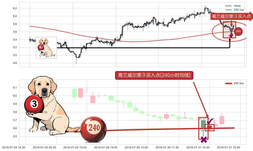 形态多维评估: ⚀ 2019-07-31 10:30:00-小时显现 葛兰威尔均线 240小时均线 第③买入点 上升趋势的中继信号,后市看涨,买进信号