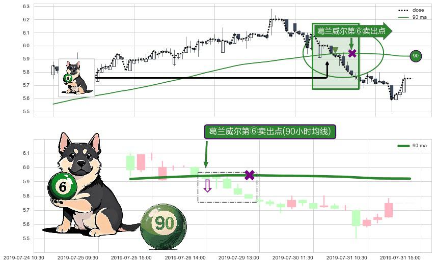 形态多维评估: ⚀ 2019-07-26 14:00:00-小时显现 葛兰威尔均线 90小时均线 第⑥卖出点 走势反转见顶信号,后市看跌,卖出信号