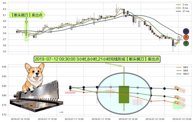 形态多维评估: ⚀ 2019-07-12 09:30:00小时显现 3小时-8小时-21小时均线 【断头铡刀】卖出点 看空信号,后市看跌,卖出