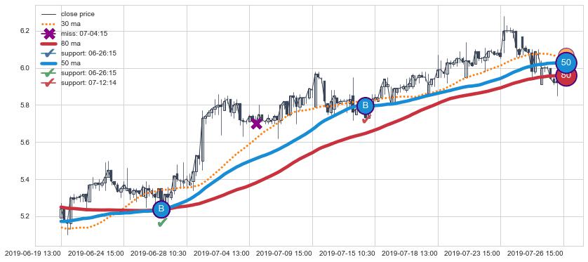 上涨趋势06-19 13:00-07-26 15:00,均线80, 50确认关键支撑2处