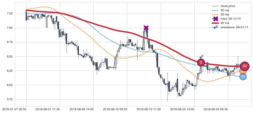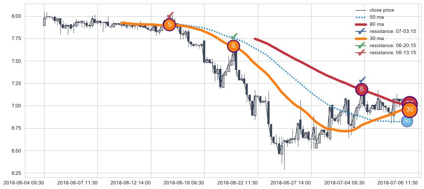 下跌趋势06-04 09:30-07-06 11:30,均线80, 30确认关键阻力3处