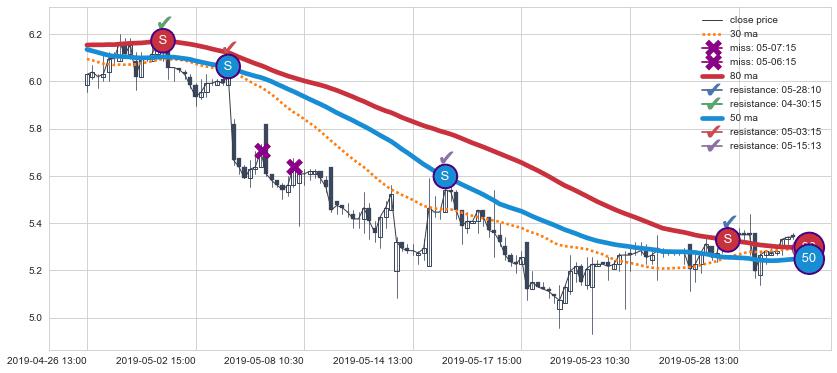 下跌趋势04-26 13:00-05-30 10:30,均线80, 50确认关键阻力4处
