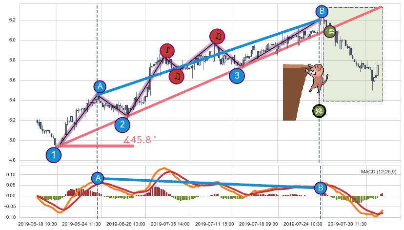 从2019-06-18 10:30至2019-07-26 13:00,共包含165个小时,阶段股价上涨19.02%,阶段股价变动位移路程比: 1 : 4,上涨趋势角度: 45.8