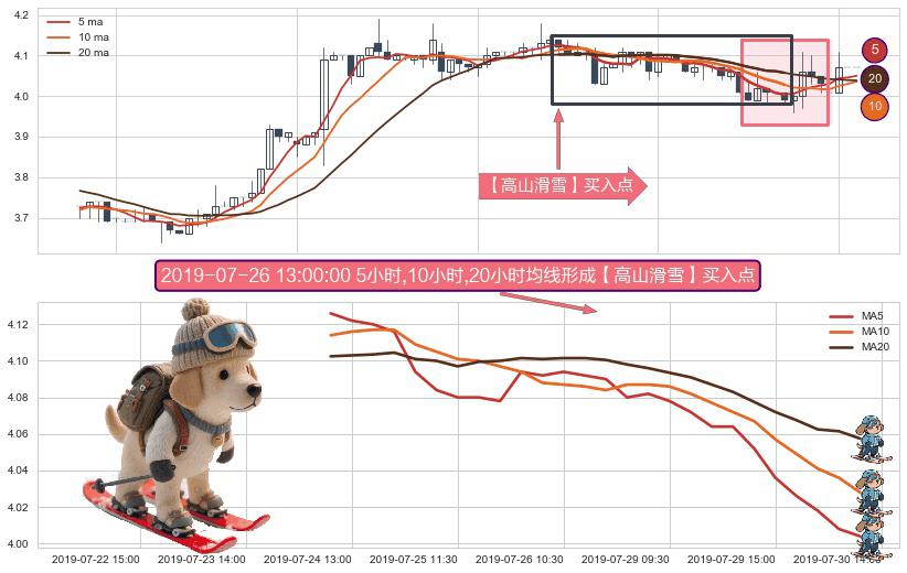 形态多维评估: ⚀ 2019-07-24 11:30:00小时-2019-07-30 13:00:00小时显现 5小时-10小时-20小时均线 【高山滑雪】买入点 看多信号,后市看涨,买入