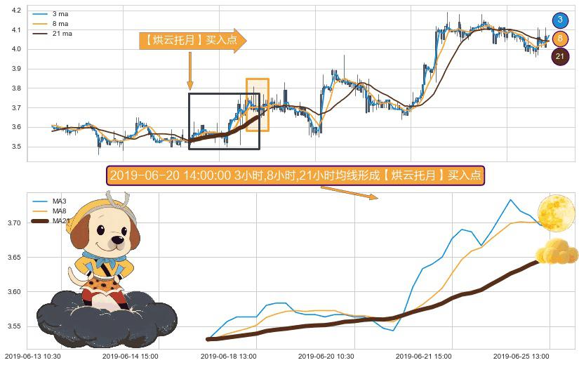 形态多维评估: ⚀ 2019-06-17 14:00:00小时-2019-06-25 13:00:00小时显现 3小时-8小时-21小时均线 【烘云托月】买入点 看多信号,后市看涨,买入