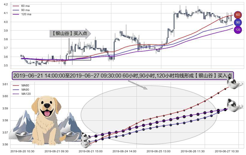 形态多维评估: ⚀ 2019-06-21 15:00:00-小时至2019-06-27 09:30:00-小时显现 60小时-90小时-120小时均线 【银山谷】买入点 看多信号,后市看涨,买入