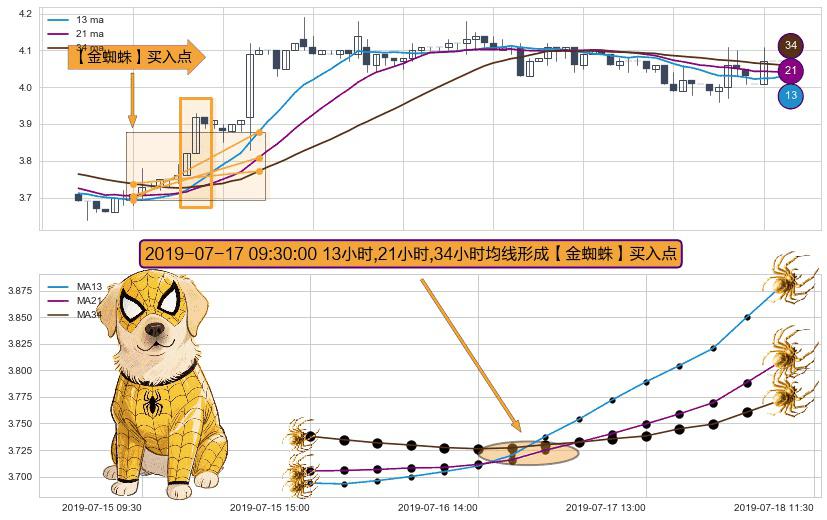 形态多维评估: ⚀ 2019-07-17 09:30:00小时显现 13小时-21小时-34小时均线 【金蜘蛛】买入点 看多信号,后市看涨,买入