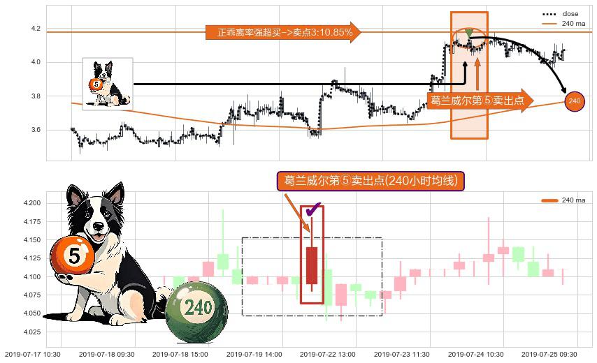 形态多维评估: ⚀ 2019-07-22 09:30:00-小时显现 葛兰威尔均线 240小时均线 第⑤卖出点 上升趋势均值回复的短线回落信号,后市看跌,卖出信号