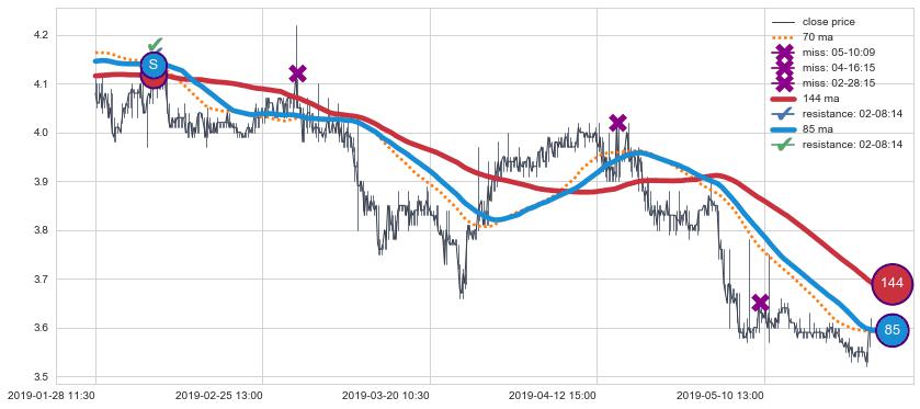 下跌趋势01-28 11:30-05-28 13:00,均线144, 85确认关键阻力1处