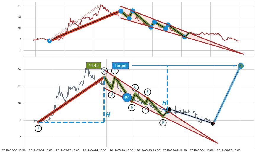 从2019-04-02 13:00至2019-07-31 15:00,共包含477个小时,阶段股价下跌-57.07%,阶段股价变动位移路程比: 1 : 7,下跌趋势角度: 42.8