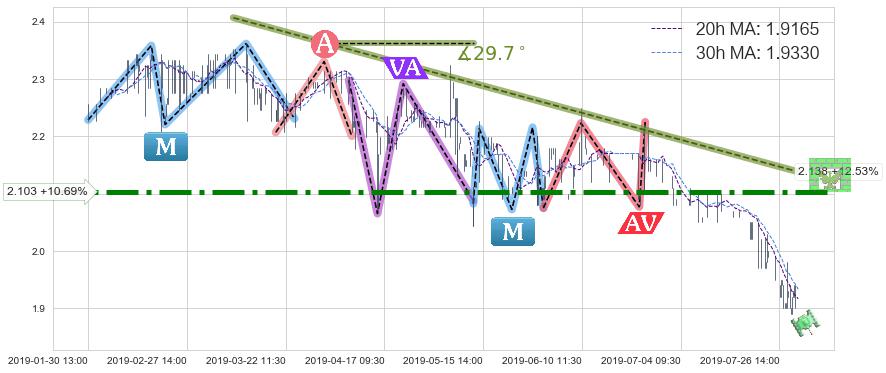 2019-06-24: 第一阻力位2.103有效抑制了下跌浪,成功阻止了价格的继续下跌。
