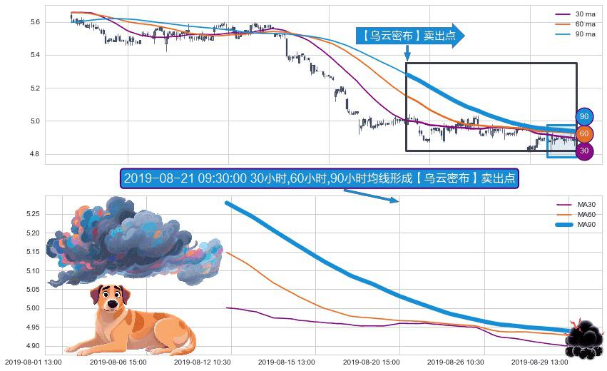 形态多维评估: ⚀ 2019-08-12 09:30:00小时-2019-08-29 15:00:00小时显现 30小时-60小时-90小时均线 【乌云密布】卖出点 看空信号,后市看跌,卖出