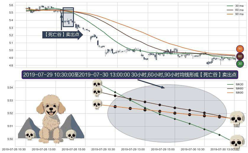 形态多维评估: ⚀ 2019-07-29 11:30:00-小时至2019-07-30 13:00:00-小时显现 30小时-60小时-90小时均线 【死亡谷】卖出点 看空信号,后市看跌,卖出