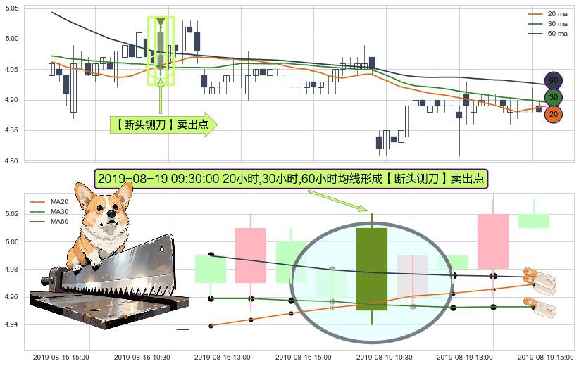 形态多维评估: ⚀ 2019-08-19 09:30:00小时显现 20小时-30小时-60小时均线 【断头铡刀】卖出点 看空信号,后市看跌,卖出