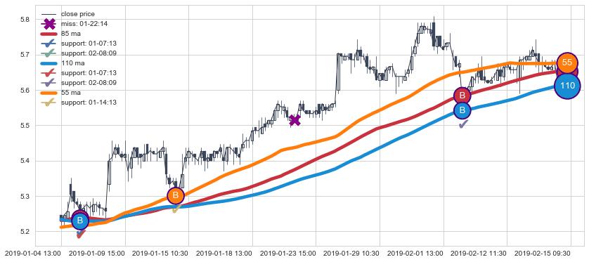上涨趋势01-04 13:00-02-15 09:30,均线85, 110, 55确认关键支撑3处