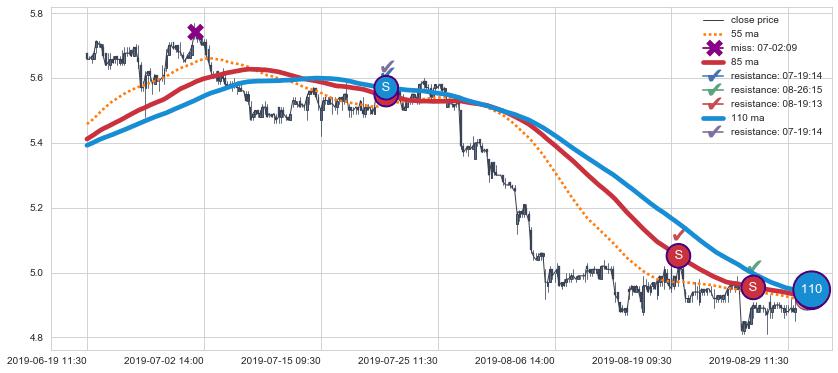 下跌趋势04-25 13:00-05-20 15:00,均线85, 110, 55确认关键阻力2处