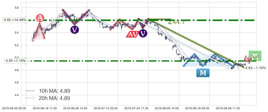 从2019-07-24 11:30至2019-08-27 14:00,共包含147个小时,阶段股价下跌-13.16%,阶段股价变动位移路程比: 1 : 3,下跌趋势角度: 44.7