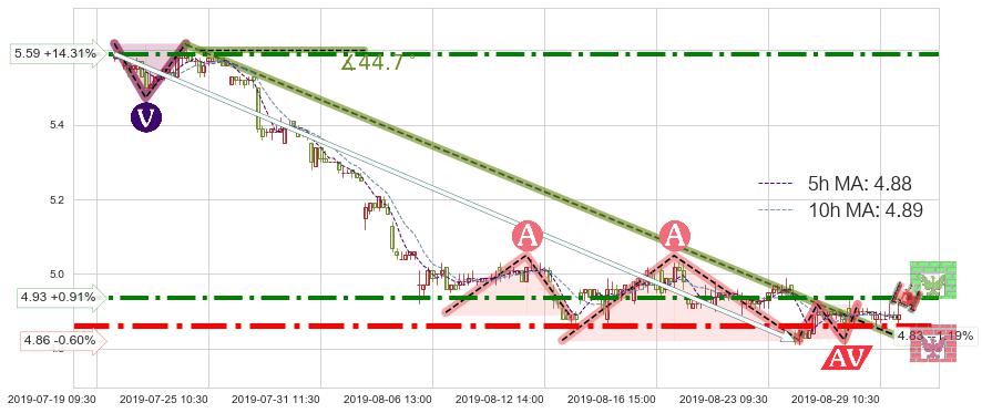 🦴 长线均值回复组合短线趋势跟踪[强阻力信号]2019-07-24 11:30-2019-08-27 14:00下跌趋势依然成立(下跌趋势跟踪依然存在),短线价格略微上行反弹(均值回复猜想),即将接近下跌趋势提供的未破位阻力价格:4.83。