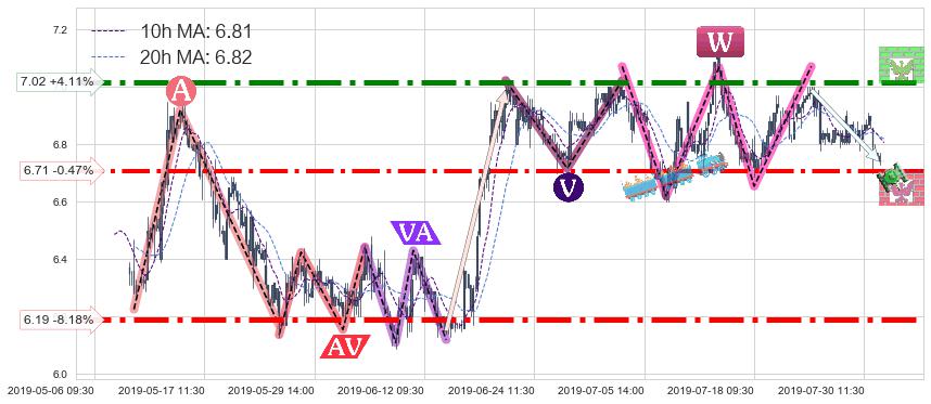 ♘ 阻力价格位7.02,可信任强度95.74%,距离最后交易2019-07-31 15:00形成的收盘价格6.74相差 +4.11%