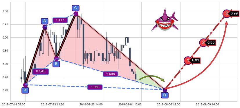 ➢ 接近预测D点位置, 随时警戒看涨【鲨鱼】形态反转启动