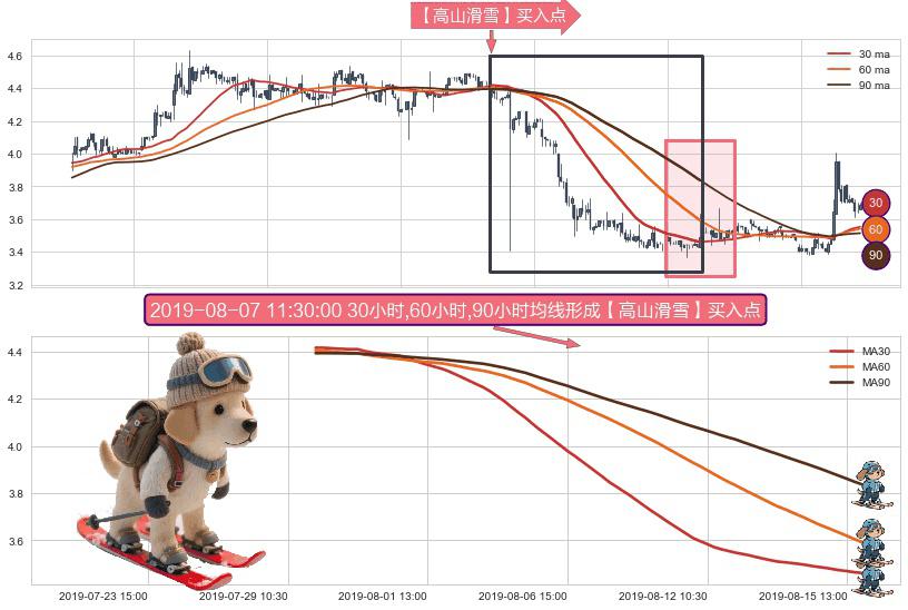 形态多维评估: ⚀ 2019-07-29 15:00:00小时-2019-08-15 15:00:00小时显现 30小时-60小时-90小时均线 【高山滑雪】买入点 看多信号,后市看涨,买入