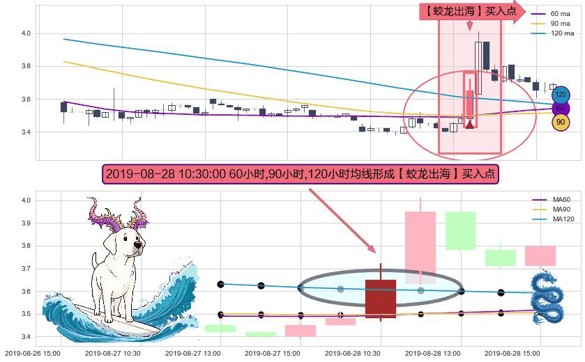 形态多维评估: ⚀ 2019-08-28 10:30:00小时显现 60小时-90小时-120小时均线 【蛟龙出海】买入点 看多信号,后市看涨,买入