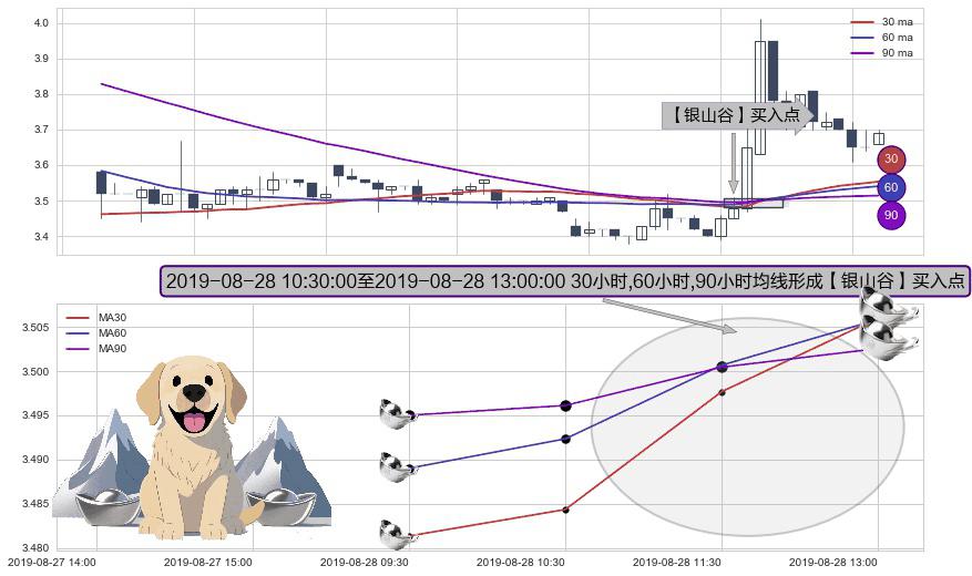 形态多维评估: ⚀ 2019-08-28 11:30:00-小时至2019-08-28 13:00:00-小时显现 30小时-60小时-90小时均线 【银山谷】买入点 看多信号,后市看涨,买入