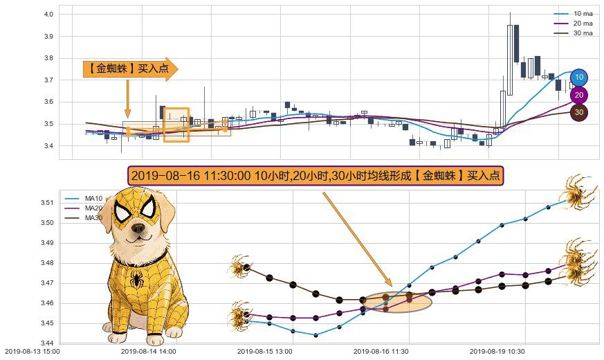 形态多维评估: ⚀ 2019-08-16 11:30:00小时显现 10小时-20小时-30小时均线 【金蜘蛛】买入点 看多信号,后市看涨,买入