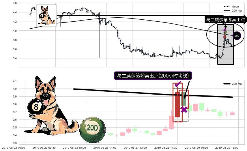 形态多维评估: ⚀ 2019-08-28 13:00:00-小时显现 葛兰威尔均线 200小时均线 第⑧卖出点 下降趋势的中继信号,后市看跌,卖出信号