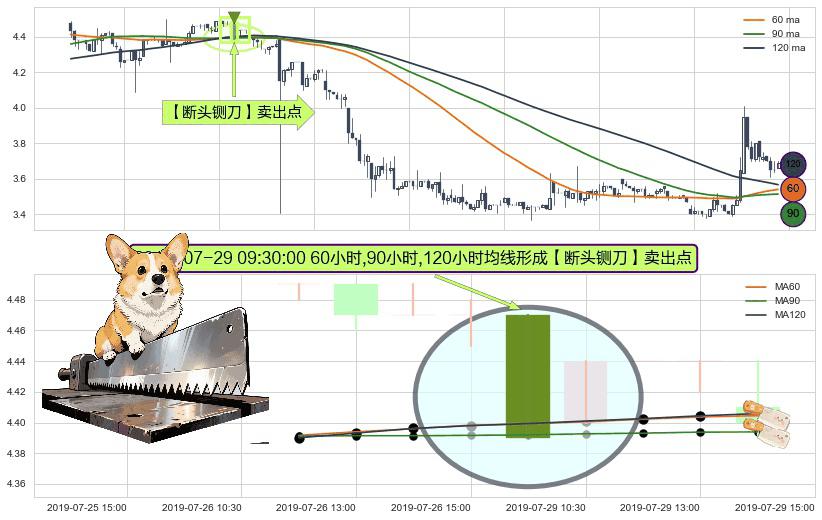 形态多维评估: ⚀ 2019-07-29 09:30:00小时显现 60小时-90小时-120小时均线 【断头铡刀】卖出点 看空信号,后市看跌,卖出