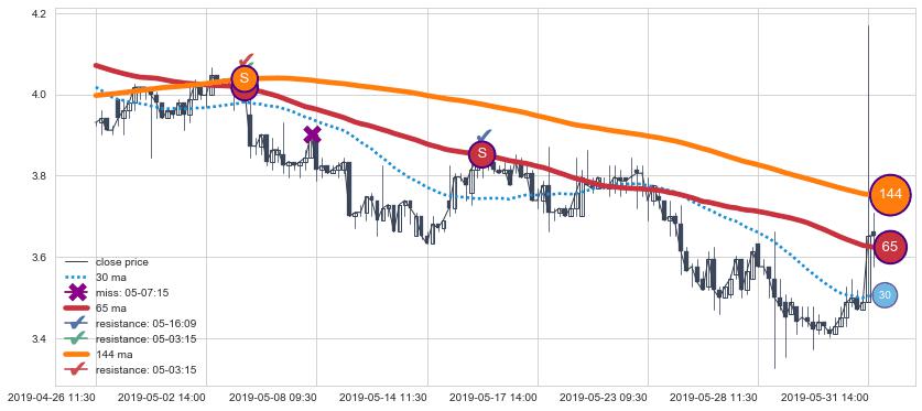 下跌趋势04-26 11:30-05-31 15:00,均线144, 65确认关键阻力2处