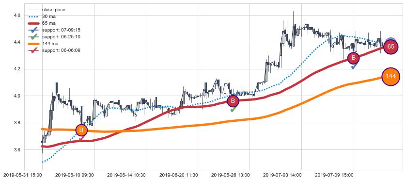 上涨趋势05-31 15:00-07-12 11:30,均线144, 65确认关键支撑3处