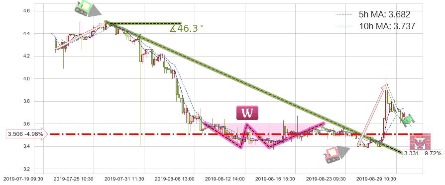 2019-08-19: 第一支撑位3.506有效抑制了下跌浪,成功阻止了价格的继续下跌。