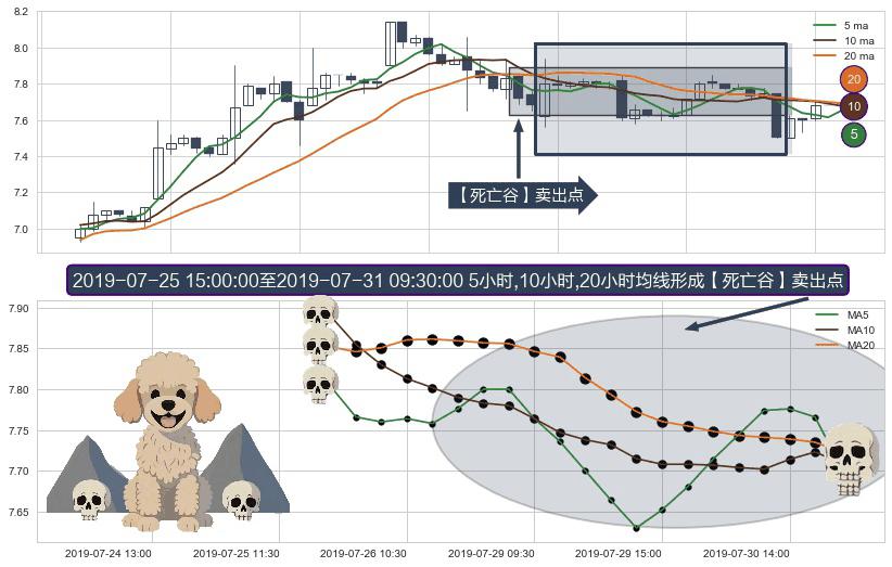 ⚀ 2019-07-26 09:30:00-小时至2019-07-31 09:30:00-小时显现 5小时-10小时-20小时均线 【死亡谷】卖出点 看空信号,后市看跌,卖出