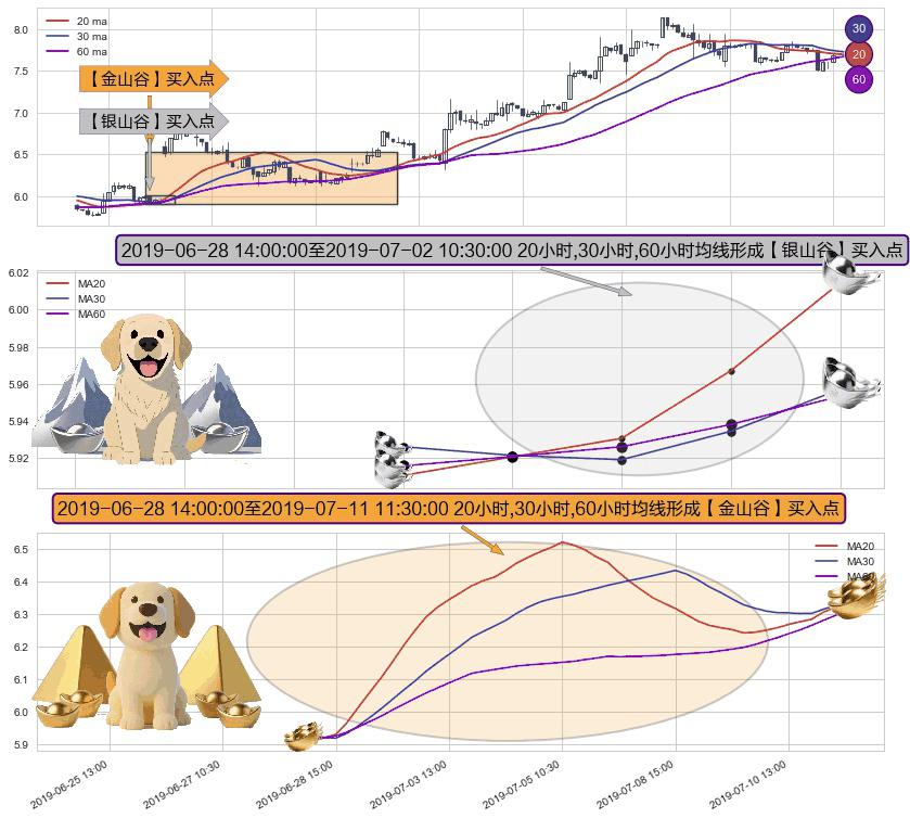 ⚂ 2019-06-28 15:00:00-小时至2019-07-11 11:30:00-小时显现 20小时-30小时-60小时均线 【金山谷】买入点 其再次确认了买入信号,可靠性更强,买入