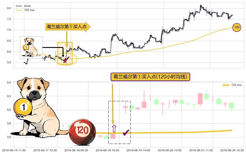 ⚀ 2019-06-18 14:00:00-小时显现 葛兰威尔均线 120小时均线 第买①入点 走势反转见底信号,后市看涨,买进信号