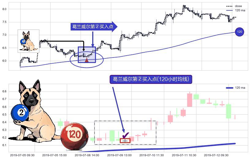 ⚀ 2019-07-09 11:30:00-小时显现 葛兰威尔均线 120小时均线 第②买入点 上升趋势的中继信号,后市看涨,买进信号
