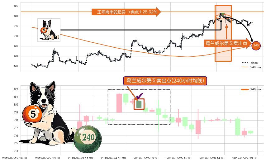 ⚀ 2019-07-24 13:00:00-小时显现 葛兰威尔均线 240小时均线 第⑤卖出点 上升趋势均值回复的短线回落信号,后市看跌,卖出信号