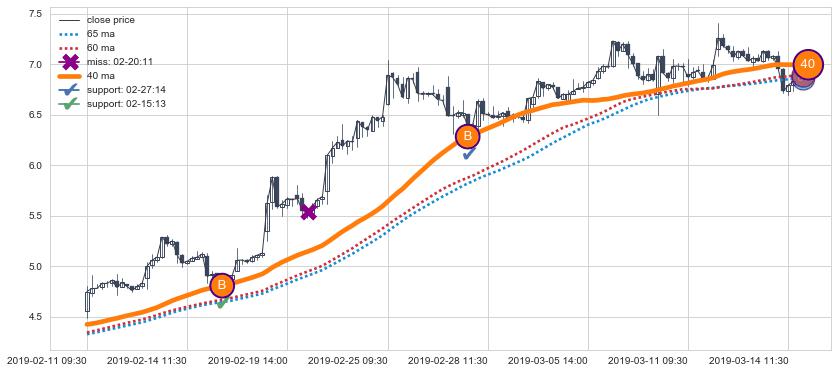⚅ 买点向上突破均线后,价格走势很纠结,不断在均线周围试探,有再次下探破位均线的可能