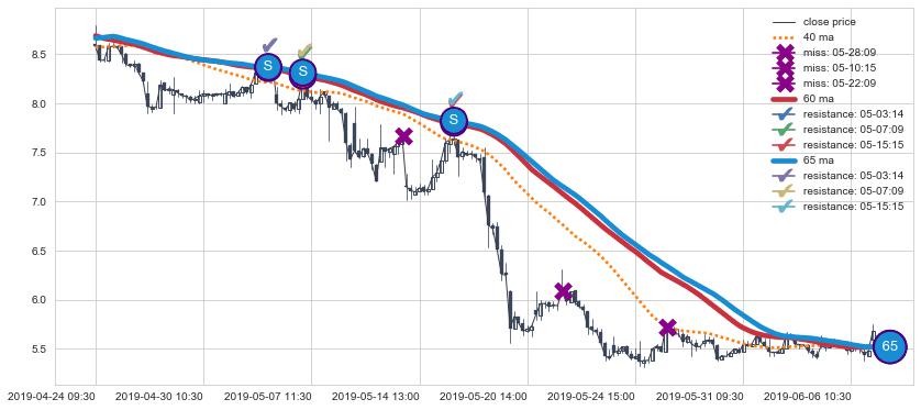 ⚀ 2019-07-10 14:00:00小时-2019-07-26 15:00:00小时显现 30小时-60小时-90小时均线 【战机起航】卖出点 看空信号,后市看跌,卖出