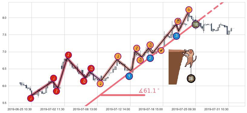 从2019-07-09 09:30至2019-07-25 14:00,共包含77个小时,阶段股价上涨23.51%,阶段股价变动位移路程比: 1 : 3,上涨趋势角度: 55.5