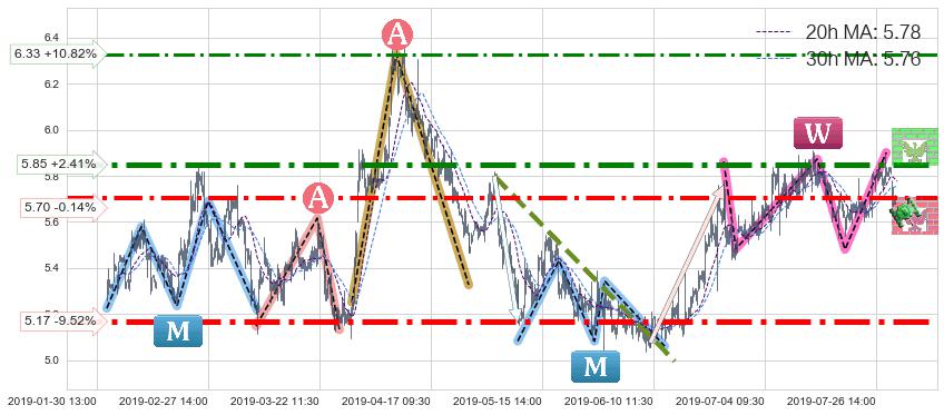 ♘ 阻力价格位5.85,可信任强度90.35%,距离最后交易2019-07-31 15:00形成的收盘价格5.71相差 +2.41%