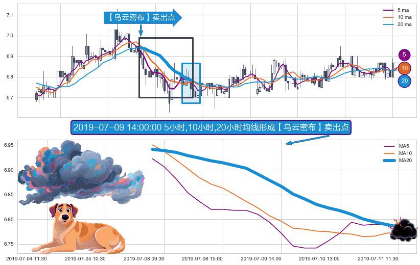⚀ 2019-07-05 15:00:00小时-2019-07-11 11:30:00小时显现 5小时-10小时-20小时均线 【乌云密布】卖出点 看空信号,后市看跌,卖出