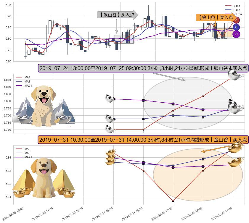 ⚀ 2019-07-31 11:30:00-小时至2019-07-31 14:00:00-小时显现 3小时-8小时-21小时均线 【金山谷】买入点 其再次确认了买入信号,可靠性更强,买入