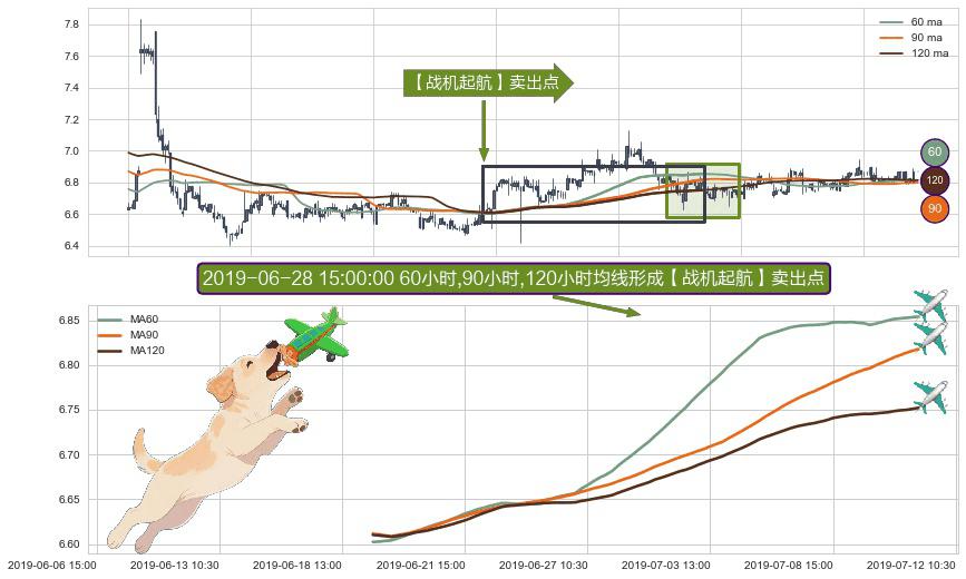 ⚀ 2019-06-19 11:30:00小时-2019-07-11 10:30:00小时显现 60小时-90小时-120小时均线 【战机起航】卖出点 看空信号,后市看跌,卖出