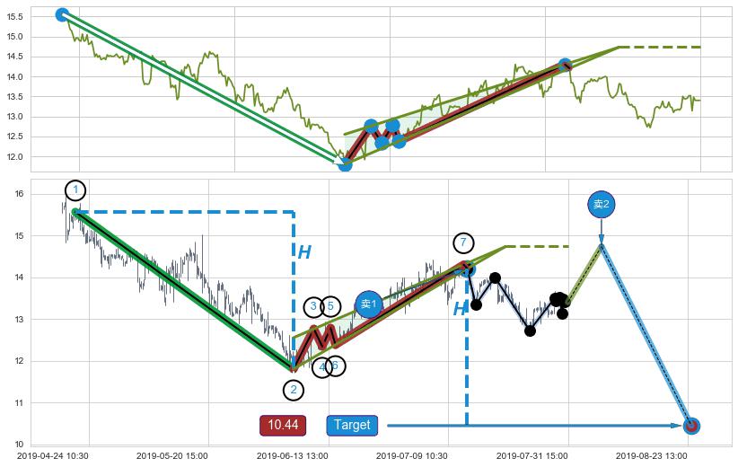 从2019-06-05 09:30至2019-06-21 10:30,共包含68个小时,阶段股价上涨8.62%,阶段股价变动位移路程比: 1 : 6