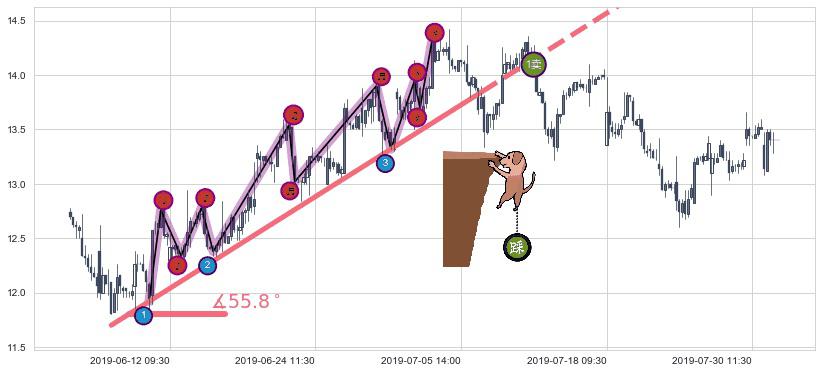 从2019-06-05 14:00至2019-07-08 15:00,共包含128个小时,阶段股价上涨16.40%,阶段股价变动位移路程比: 1 : 5,上涨趋势角度: 55.8