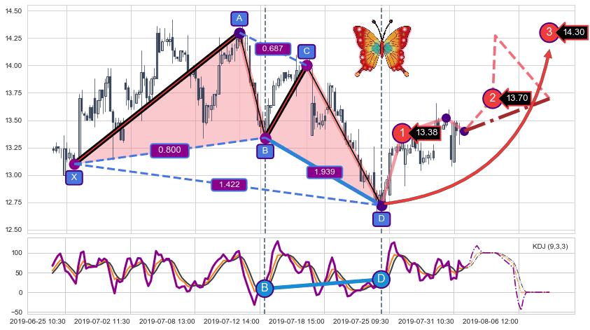 ➣ 已完成【蝴蝶】形态起点X: 06-25:14, 终点D: 07-24:13, 共120交易小时